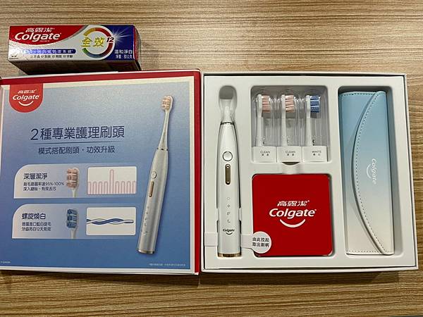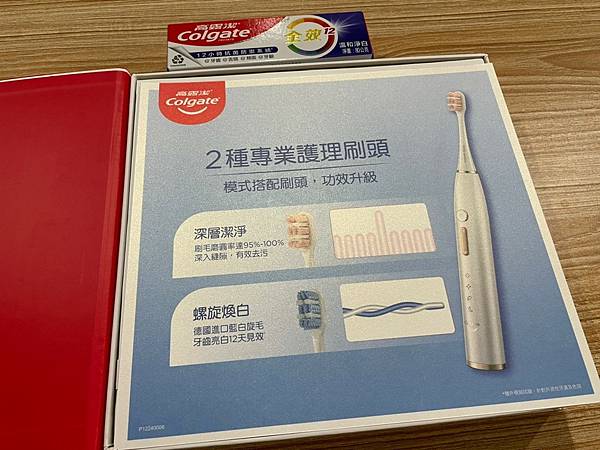 打開包裝,則可看到它的另外一個亮點,擁有兩種專業護理刷頭,分別為深層潔淨及螺旋煥白,深層潔淨顧名思義就是強調可深入牙縫有效清潔去汙,而螺旋煥白是強調牙齒能夠亮白。