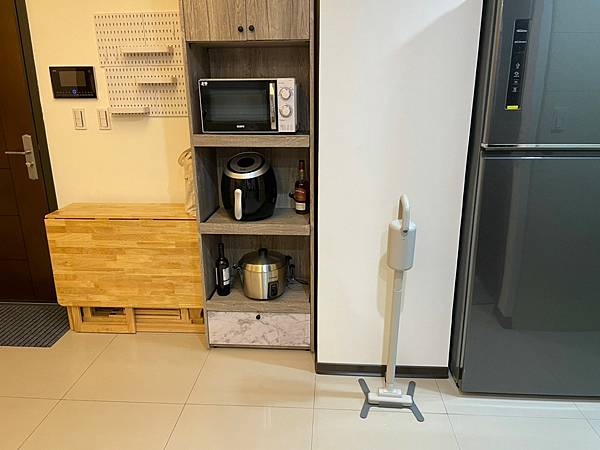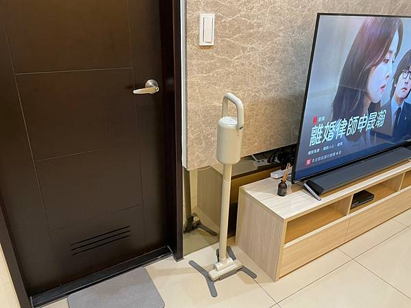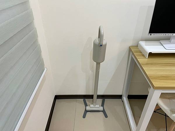 而最下方的站立立架是金屬材質的,有點重量,所以吸塵器放在上面不會倒!擺在家中各處也不違和,真的蠻美的!不管是放在客廳電視旁、牆邊,還是房間內都能呈現出不同的感覺跟風格呢。