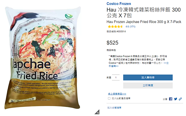 這款韓式雜菜粉絲拌飯是好市多於2020年所推出的新產品,主打內餡豐富、烹調簡易,是近年許多人進好市多必買的好物之一。內含共有7小包,每包大概300公克,內容物除了有飯及冬粉外,還有大量的蔬菜,像是紅蘿蔔、香菇、洋蔥、甜椒、波菜、蔥等等,料理方式上則是直接微波就可吃,加上包裝背面就有詳細的操作方式,基本上很難失誤。吃起來口感不錯,因多元蔬菜而豐富,裡頭還帶點韓式的甜味,搭配海苔吃更顯特別。