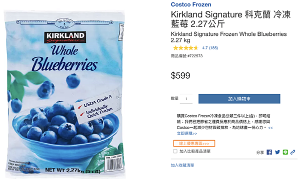 除了冷凍蔬菜外,好市多的冷凍藍莓、草莓、野莓等也是許多人會購買的熱門品項,而我私心最愛的就是這款科克蘭冷凍藍莓,它採用全天然整顆新鮮藍莓,透過急速冷凍保有水果本身鮮度,不單單可以直接食用,也可加入其他水果打成冰沙、果汁,或著搭配優格、鬆餅、麥片作食用,簡單快速就能製作出各種型態的早餐和甜點。