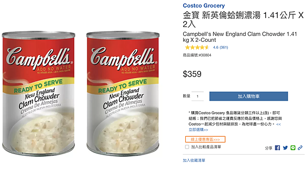 這款蛤蜊濃湯在好市多網站上也有著高達4.6顆星的評價,習慣喝湯的人一定要喝看看!它使用美國東岸鮮補蛤蠣製作而成,內含馬鈴薯、蛤蜊、芹菜等原料,喝起來口感綿密還帶有奶油香氣,無須另外加水,微波加熱3分鐘即可飲用,不得不說真的是非常方便,超級適合愛喝湯又不想備料的人XD。不過唯獨要注意的是,本產品內含牛奶、小麥、大豆、貝類及魚類成分,如果對這些東西過敏的人得小心留意。