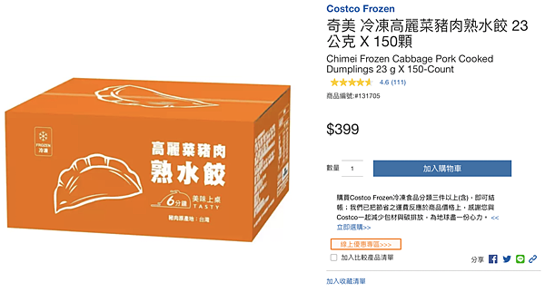 水餃也是許多家庭中會常備的食材,可能因應消費者需要更便利的需求,熟水餃因而橫空出世。好市多的這款奇美高麗菜豬肉熟水餃,使用的是台灣國產豬前腿肉,內餡搭配高麗菜、洋蔥,且不添加味精跟肉精粉,皮薄軟Q,也因為是熟水餃,所以可用多元方式烹調,除了常見的水煮,還可以煎、炸、蒸,還能做成湯餃,可依大家的喜好做不同變化。價格的部分,400元有150顆,一顆差不多是2.6元左右,跟外面的行情相比不算很貴,適合小資族、懶人族購買回家!